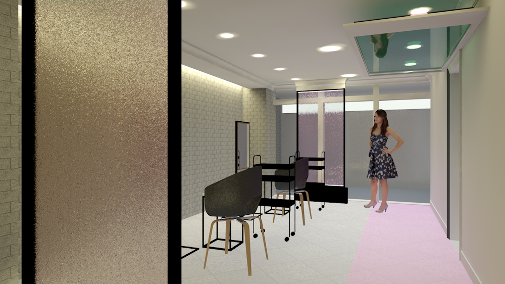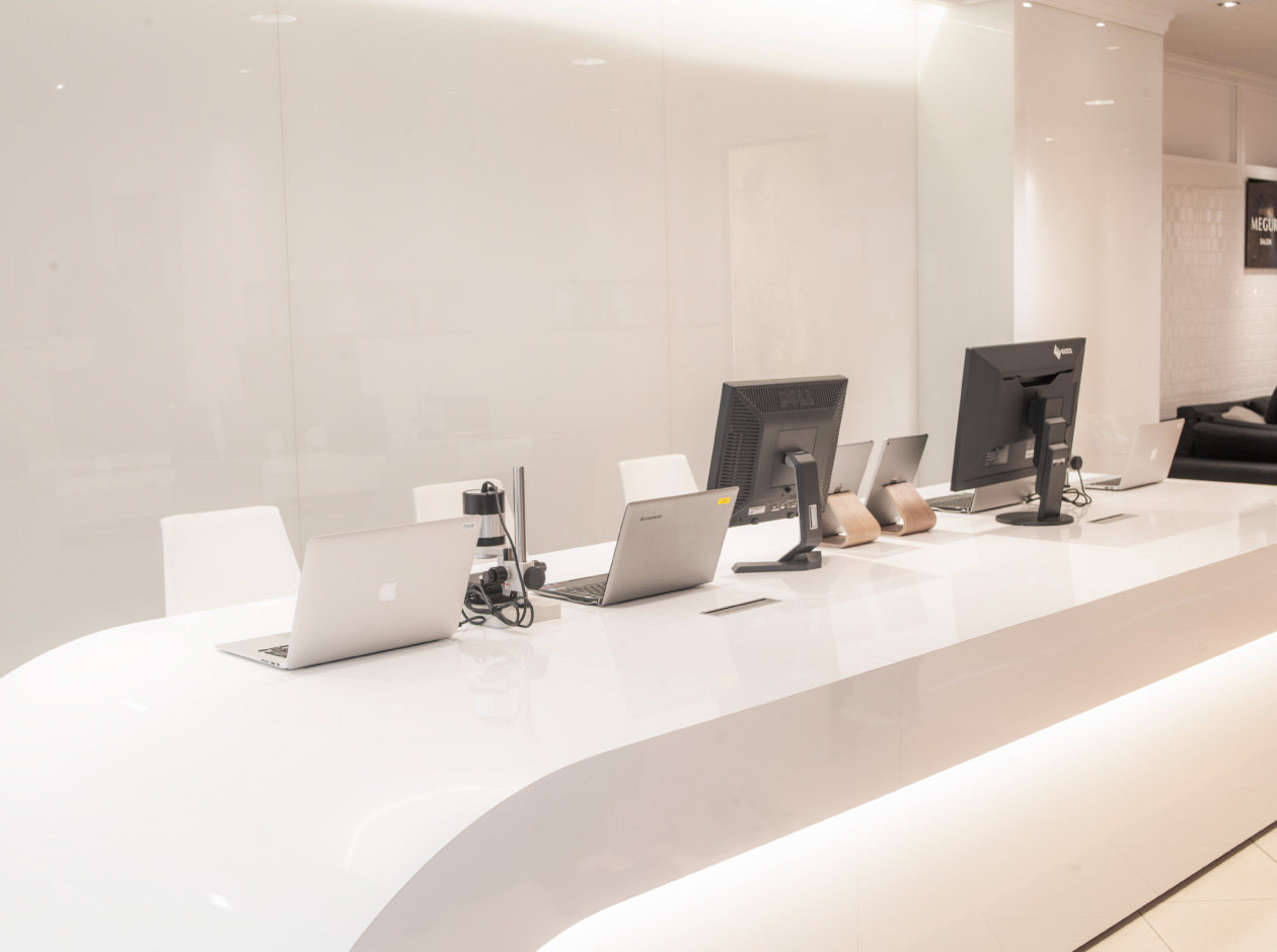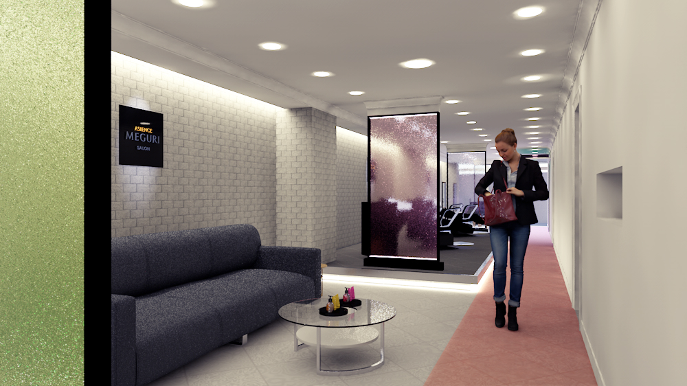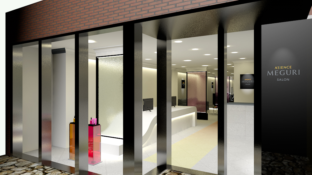 ヘアケアブランド「アジエンスめぐり」のプロモーションサロンのインテリア&ディスプレイデザインを担当しました。 科学と自然の力の融合がブランドのテーマ。 白の塗装、白のカラーガラス、白のサブウェイタイルを壁面に使用し、科学性を表現しながらもブローバーらしいおしゃれ感がでるように細部に気を配裏ました。 自然の力の象徴として「水」をフロントのウォーターパネルで、「光」を床のグラデーションで表現しています。