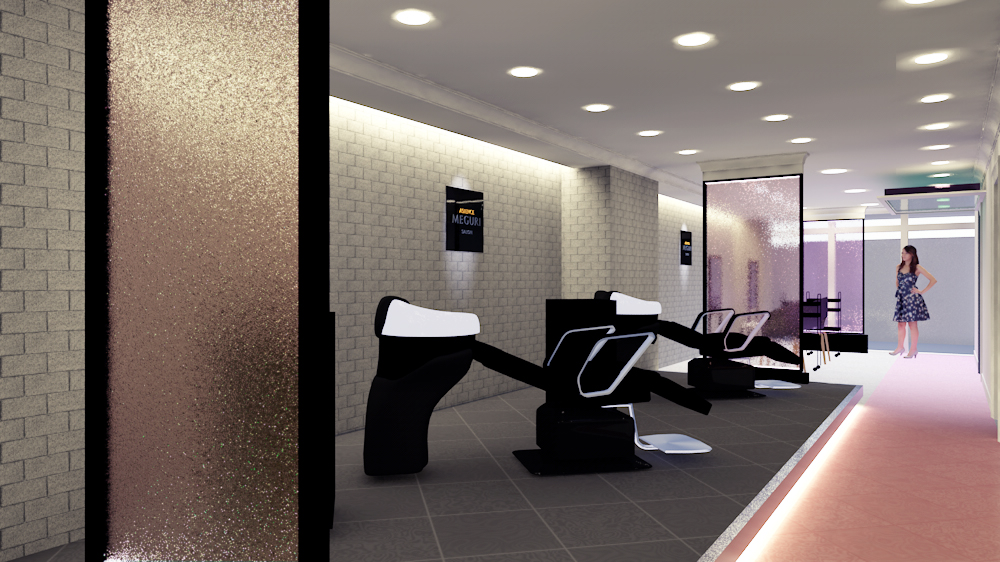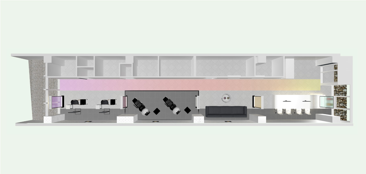 We designed the interior and display for the promotional salon of the haircare brand “ASIENCE Meguri.” The brand’s concept centers on the fusion of science and nature. To express the scientific aspect, we used white-painted surfaces, white-colored glass, and white subway tiles across the walls—balancing clarity with a refined, Blowbar-inspired aesthetic. As symbols of natural energy, “water” is represented through a front-facing water panel, while “light” is expressed via a soft floor gradient.