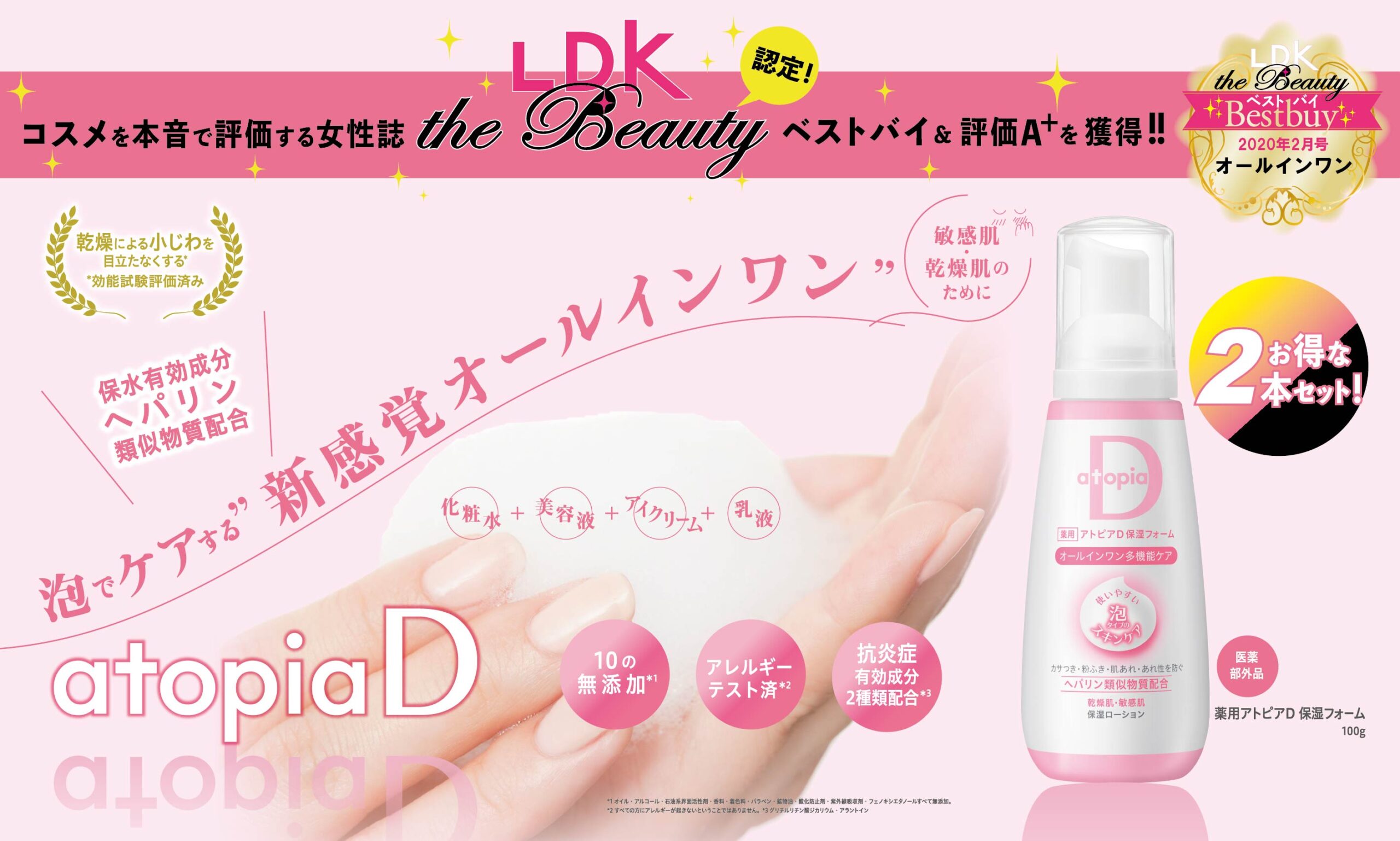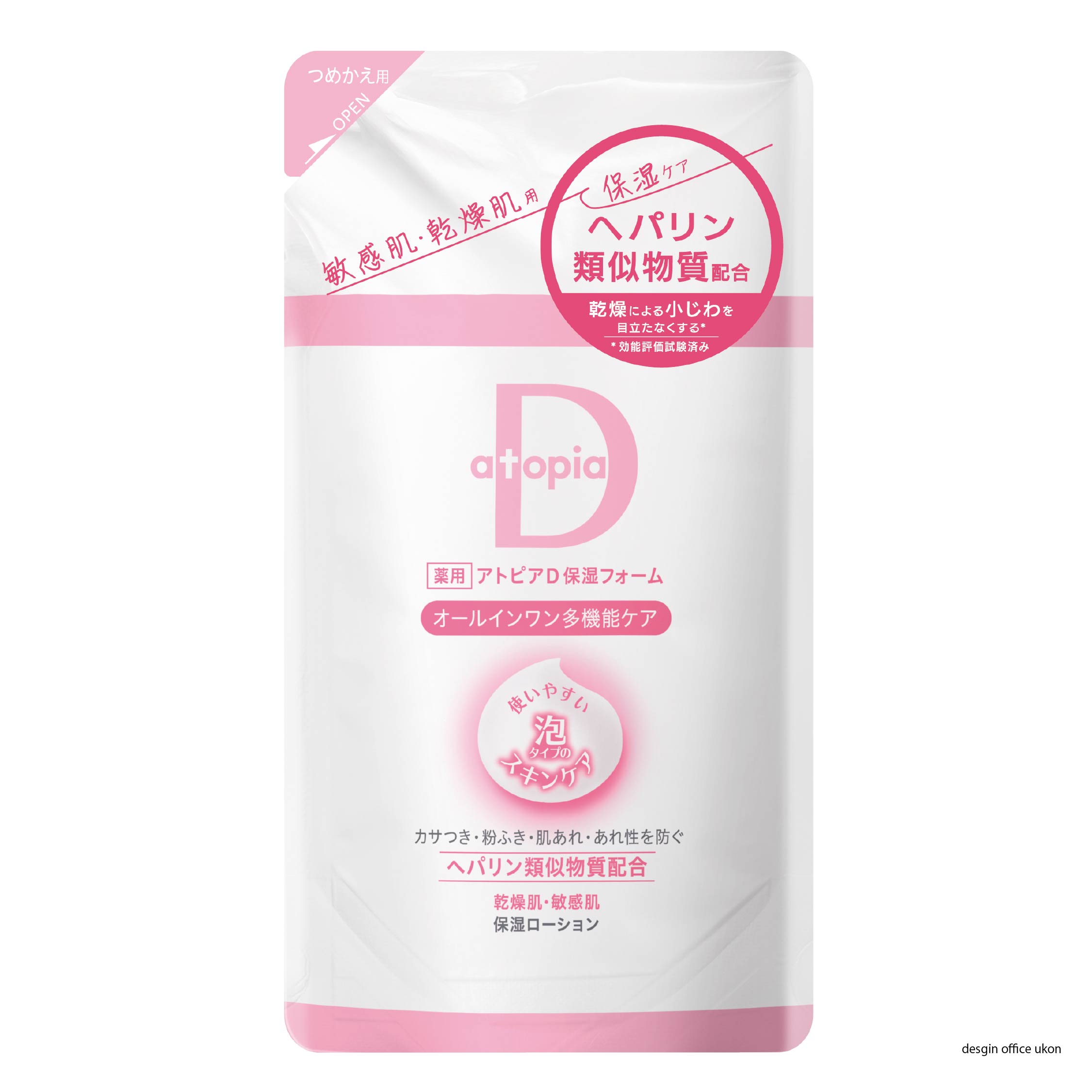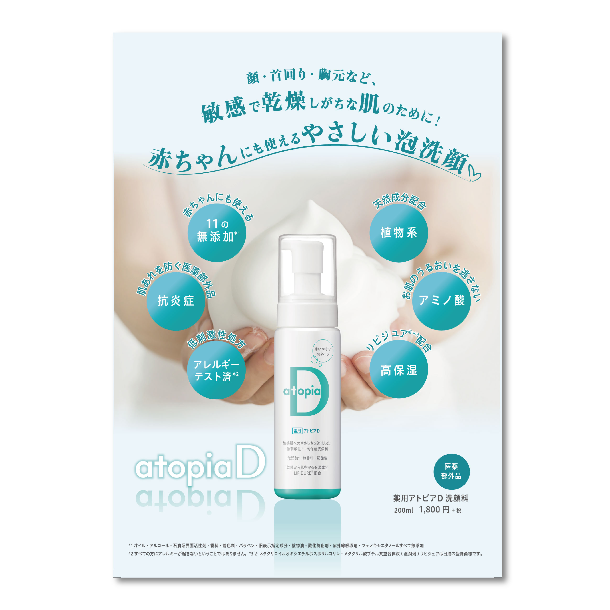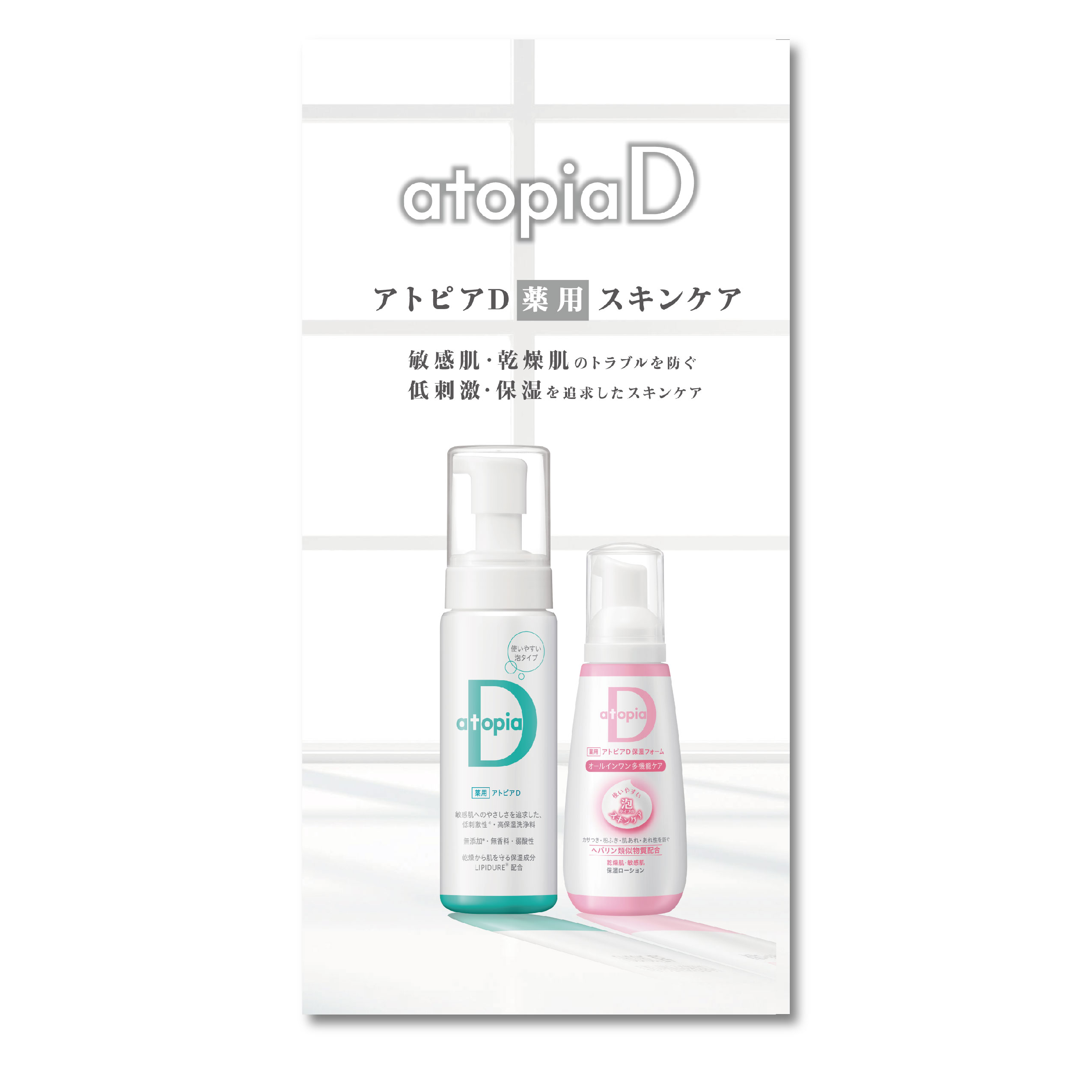 敏感肌向けスキンケア「atopiaD」の高保湿ラインにて、パッケージおよびキービジュアルのデザインを担当いたしました。 商品特徴である“泡”をアイコンとして視覚化し、白を基調とした中にピンクの差し色を添えることで、清潔感と肌へのやさしさを表現しています。リーフレット、A5サイズのPOP、什器などの販促ツールも一貫して制作。 現在、バラエティストア・ドラッグストア・ECサイトにて展開中です。