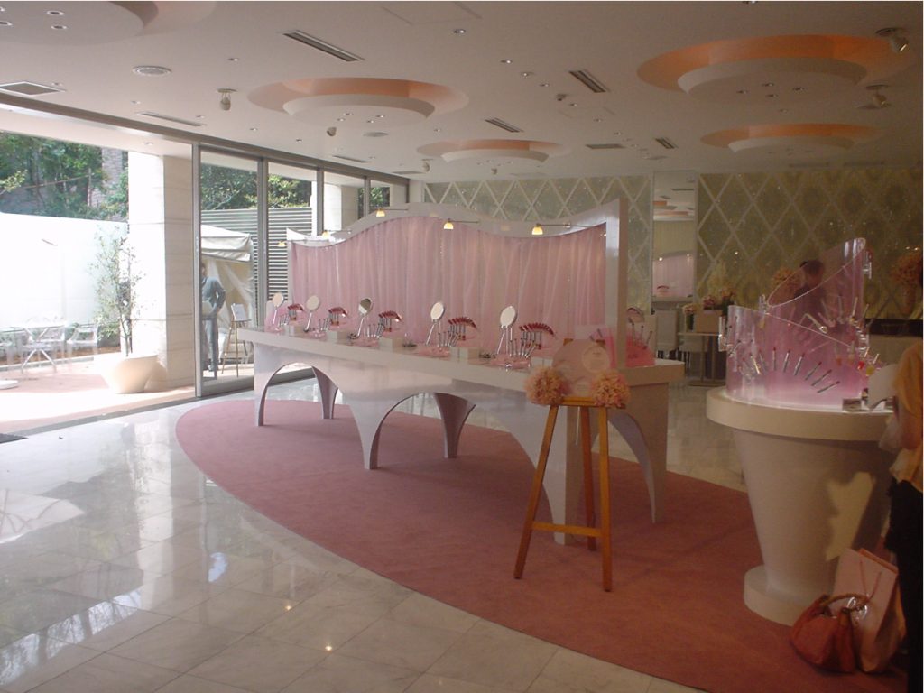 メイクブランド「AUBE」の新商品発表会にて、展示空間のデザインを担当しました。 新発売の口紅とグロスの“ふんわりとした仕上がり”を、什器の仕切りに使用したピンクのカーテンや、アクリルパイプに貼ったグラデーションで表現。 やわらかな質感と透明感が伝わる、軽やかな空間構成を意識しています。