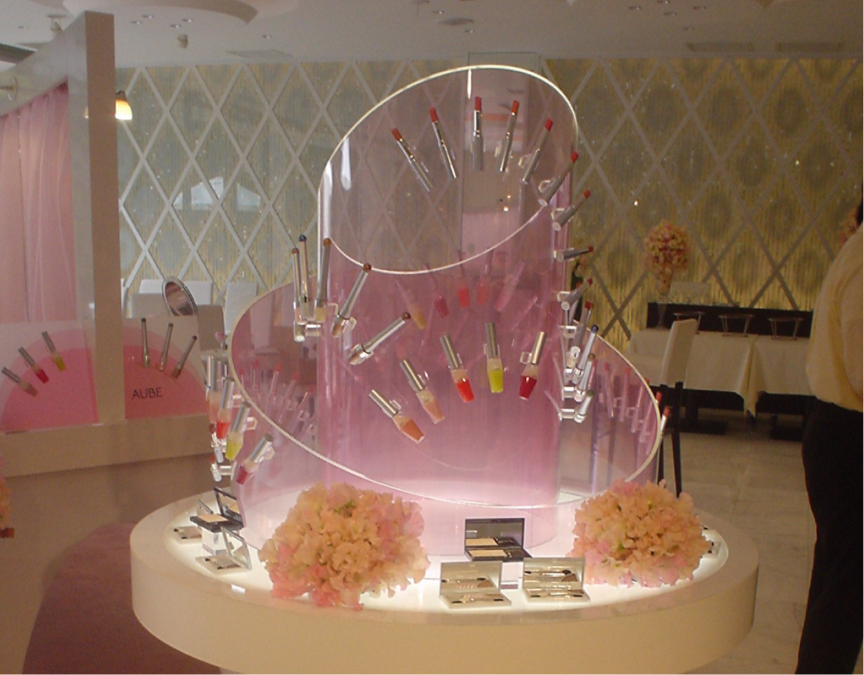 We designed the exhibition space for the new product launch event of the makeup brand AUBE. To express the soft finish of the newly released lipsticks and glosses, we incorporated pink curtains as partition elements and applied gradient films to acrylic pipes. The overall spatial composition evokes lightness, softness, and translucency—reflecting the texture and tone of the products.